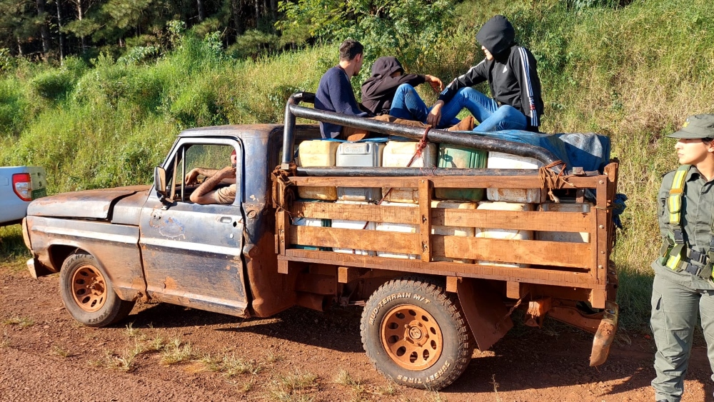 Efectivos de Gendarmería realizaban esta tarde un control sobre la ruta nacional 12 en el acceso a Colonia Delicia cuando divisaron una camioneta que trasladaba 75 bidones de plástico con combustible.