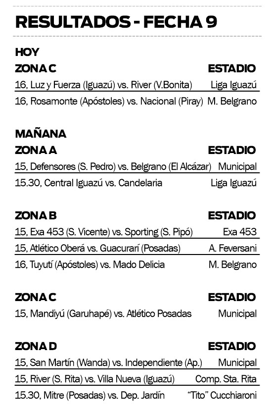 En el estadio de la Liga de Iguazú, Luz y Fuerza recibirá a River de Villa Bonita; mientras que en el estadio General Manuel Belgrano de Apóstoles, el ya eliminado Rosamonte enfrentará a Nacional de Puerto Piray, dos duelos trascendentales.