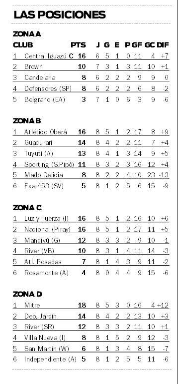 Por su parte, en la Zona D, el choque más saliente será, sin dudas, el que animarán Bartolomé Mitre de Posadas y Deportivo Jardín América, puntero y escolta de la llave. El Auriazul tiene un pie en cuartos y lo conseguirá si rescata al menos un punto. También puede avanzar hasta con una derrota, pero en ese caso dependerá que River de Santa Rita no le gane en esa misma jornada a Villa Nueva de Iguazú.