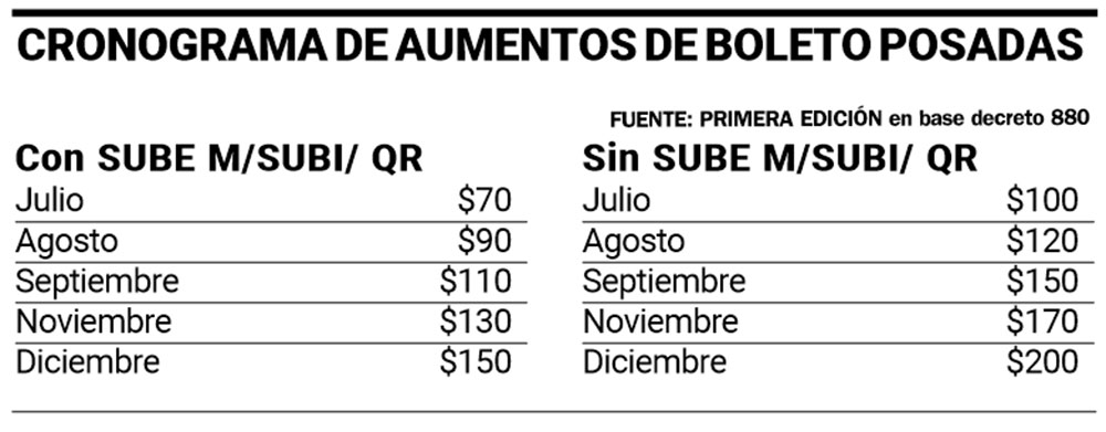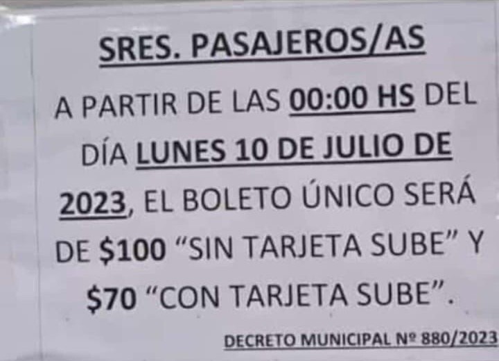 En un solo decreto, la comuna posadeña le dio los incrementos de boletos hasta diciembre próximo. Así, en julio con la tarjeta SUBE Misionera, SUBI o el código QR (todas de SUSA, la empresa Z) el costo será de $70 (actualmente está en $50). Sin alguno de esos sistemas electrónicos, el boleto aumentará a $100 de los $70 actuales.