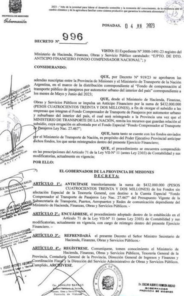 PRIMERA EDICIÓN accedió al decreto 996 de la Gobernación misionera, fechado el 4 de julio pasado, donde se decidió anticipar el pago de 432 millones de pesos del fondo compensador de transporte de pasajeros automotor urbano al Grupo Z.
