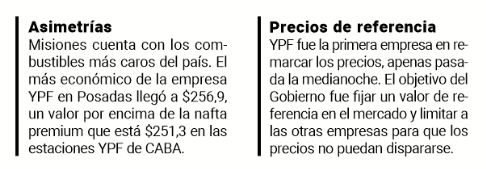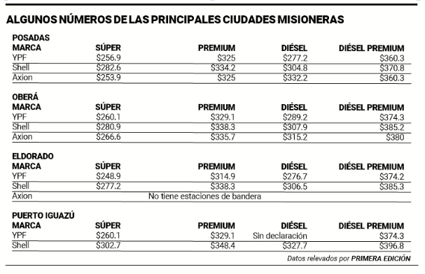 Aunque el aumento autorizado por la Secretaría de Energía fue del 4,5% para este mes, los precios no son los mismos en todos lados. Es así que, el litro de nafta súper de YPF en Posadas sale $256,9, mientras que, en Puerto Iguazú, el mismo combustible, también de YPF, está $260,1.
