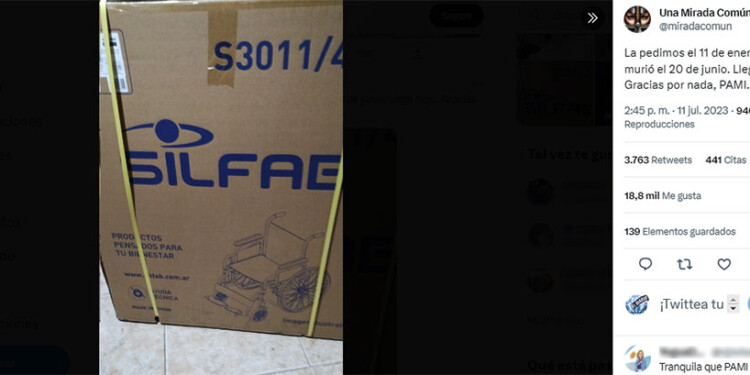 Bajo el usuario @miradacomun, explicó en un tuit que pidieron una silla de ruedas al PAMI el 11 de enero, su mamá murió el 20 de junio y la silla de ruedas llegó este martes 11 de julio.