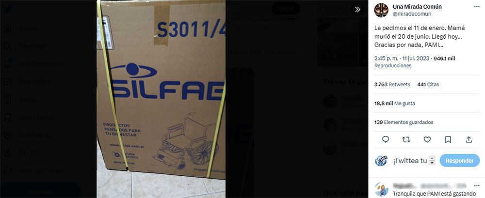 Bajo el usuario @miradacomun, explicó en un tuit que pidieron una silla de ruedas al PAMI el 11 de enero, su mamá murió el 20 de junio y la silla de ruedas llegó este martes 11 de julio.