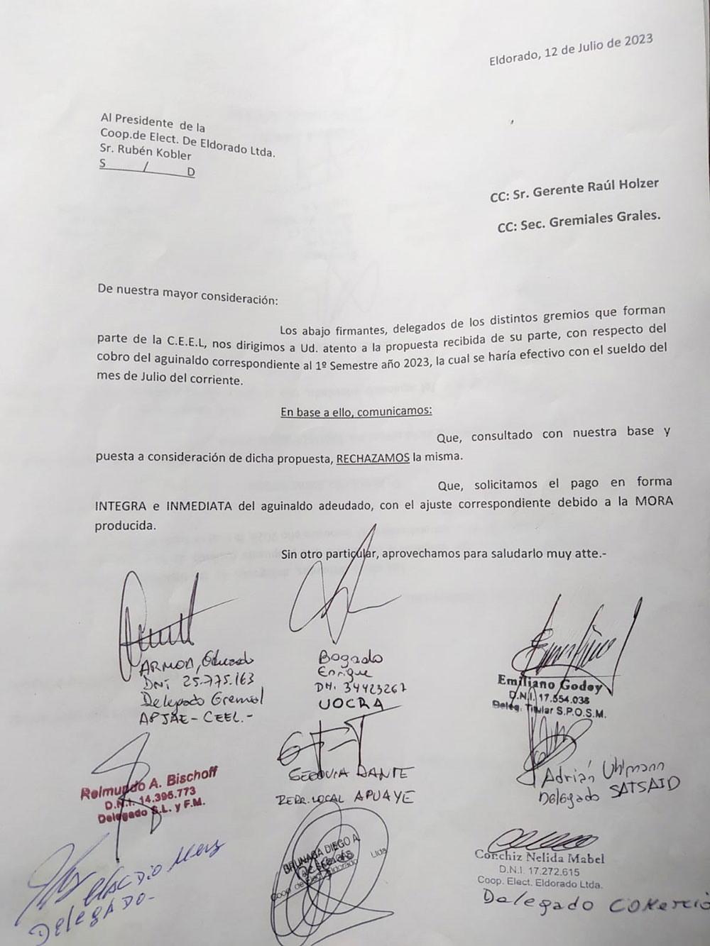 En ese contexto, en las últimas horas se conoció una carta firmada por un grupo de sindicatos (Luz y Fuerza, SATSAID, UOCRA, APJAE CEEL, SPOSM y Comercio entre otros) que enviaron a Rubén Kobler (presidente de la CEEL e intendente de Nueve de Julio) donde rechazaron que el medio aguinaldo se pague en agosto con los salarios del mes en curso.