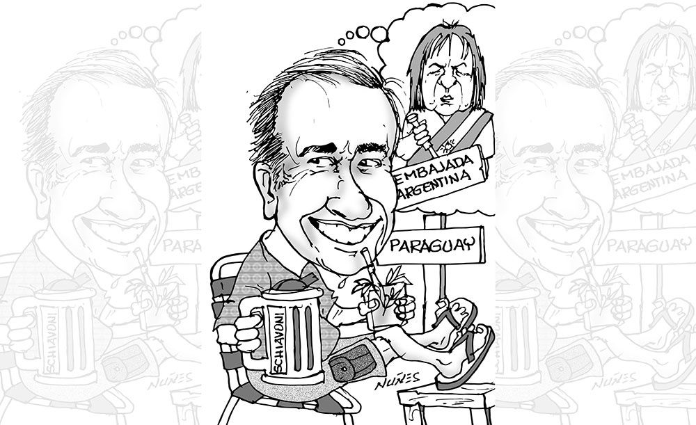 … en su “renunciamiento” forzado por la conducción porteña del PRO, el senador nacional Humberto Schiavoni habría conseguido la promesa de ser el próximo embajador argentino en Paraguay si gana Patricia Bullrich la presidencia de la Nación. “No está nada mal sacar más de 18 mil dólares al mes, más viáticos y sin gastar en nada para el día a día en su misión diplomática. Al blue de hoy son casi 9 millones de pesos por mes y al oficial casi 5 millones. Es mucho más que un senador”, analizó un envidioso dirigente al que no le habían ofrecido nada hasta ahora.