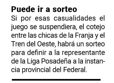 En la reunión de dirigentes a principios de semana también se estableció que si el partido se volviera a suspender por el mal tiempo, el representante posadeño surgirá de un sorteo entre La Picada y Guaraní, ya que no hay tiempo para reprogramar el partido y además hoy vence el último plazo que le dio la FeMiFu para comunicar el nombre del representante posadeño.