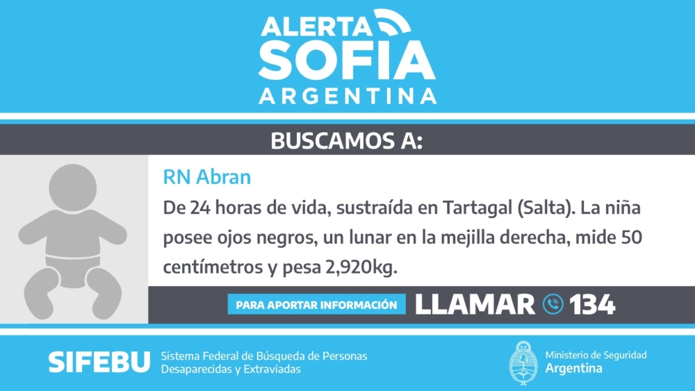 Una beba recién nacida fue robada este viernes a la mañana de la sala de maternidad del hospital salteño de Tartagal. La criatura estaba en la habitación con sus padres, quienes se ausentaron unos momentos y, al regresar, advirtieron que su hija ya no estaba en la cuna.