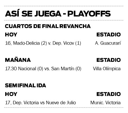 Este fin de semana también se dará a conocer a los protagonistas de la otra llave de semifinales, ya que se disputarán los partidos de vuelta de cuartos de final que fueron postergados. En la tarde de hoy, en el Estadio Andrés Guacurarí de Colonia Delicia, la Asociación de Clubes Mado-Delicia recibirá al Deportivo Vicov, con una mínima ventaja por haberse impuesto en la ida por 2 a 1.