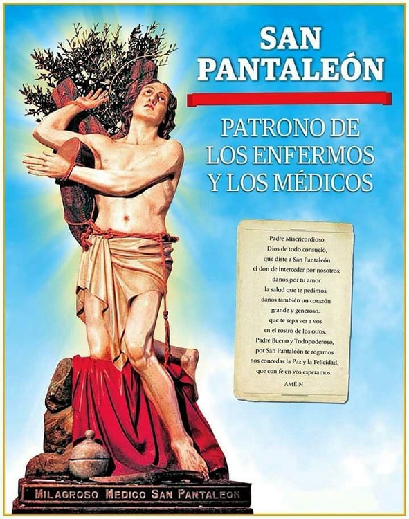 Según el santoral del 27 de julio, es el día de San Pantaleón, un médico mártir nacido a fines del siglo III en Nicomedia (la actual Turquía). Su nombre, en griego, significa: “El que se compadece de todos”. Tiene el honor de ser el patrono de los médicos y enfermos, uno de los catorce santos auxiliadores y de los santos anárgiros. Lo que se conoce de San Pantaleón está en un antiguo manuscrito del siglo IV que se encuentra en el Museo Británico, allí se indica que era hijo de Eustorgio y Eucuba. Fue médico como su padre y pese que su madre era cristiana se dejó llevar por la vida del mundo pagano y rechazó la fe.
