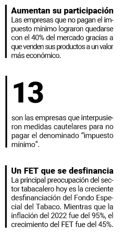Así, el incumplimiento del pago del impuesto mínimo por parte de estas empresas significa una menor facturación de dichas marquillas, que tributan por debajo del 7% establecido, lo que resiente de lleno la recaudación del FET y el pago a las obras sociales correspondientes a los productores.