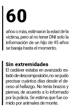 El cadáver de la mujer, que se estima habría tenido más de 60 años antes de morir, fue encontrado sin brazos y piernas por un colono que transitaba por la zona de manera circunstancial.