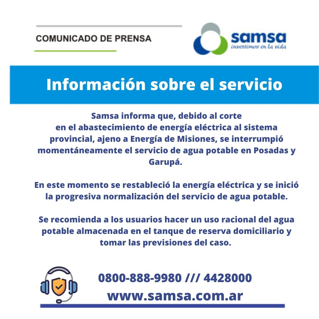 A raíz del corte masivo de energía, SAMSA informó oficialmente que, en principio, se había interrumpido el servicio de agua potable en Posadas y Garupá.