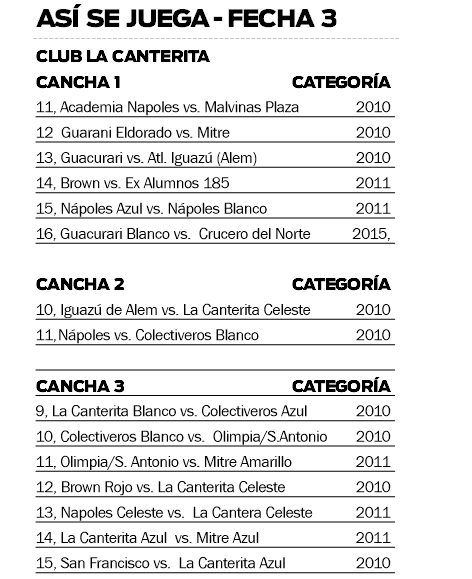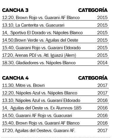 Por otra parte, los encuentros de los cuartos de final se disputarán desde mañana en los mismos escenarios en donde jugaron cada una de las categorías, es decir en canchas del club Brown y La Canterita FC.