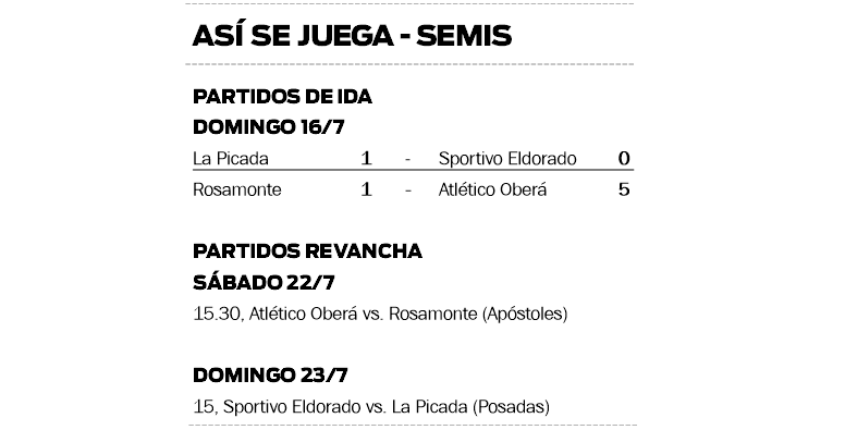 La actividad se pondrá en marcha el próximo sábado con el encuentro que protagonizarán Atlético Oberá y Rosamonte de Apóstoles. Se jugará a partir de las 15.30, en el estadio Alfonso Feversani. Las Decanas ya dieron un paso clave al golear en la ida 5 a 1 y lo definirán este fin de semana en su casa.
