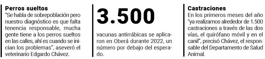 En el canil municipal se vacuna todos los días de 6 a 12 y 14 a 20. Sin embargo, Chávez señaló que “la gente no aprovecha este servicio, que es gratuito, porque todavía hay en nuestra ciudad muchos animales domésticos sin las vacunas anuales obligatorias. El año pasado se aplicaron alrededor de 3.500 vacunas antirrábicas, prácticamente lo mismo que castraciones. Es un número muy bajo para la cantidad de perros y gatos que hay en Oberá”, insistió el médico veterinario.