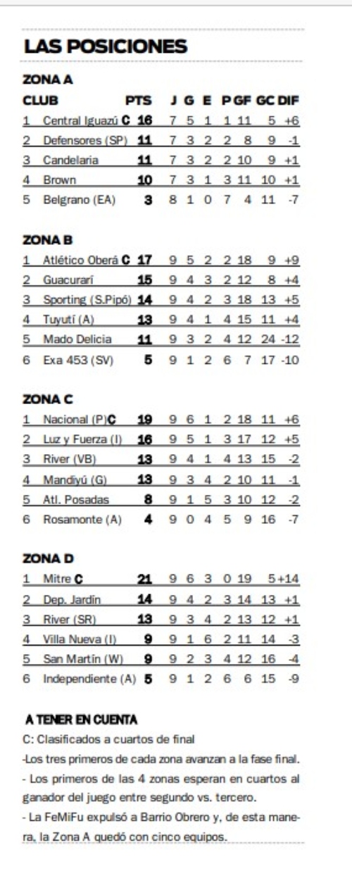 En tanto, el domingo, en la zona A, en donde el único clasificado es Central Iguazú, Candelaria recibirá a Defensores de San Pedro, desde las 15.30.