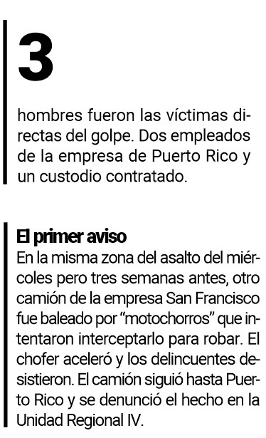 Los tres fueron reducidos, según sus relatos, por dos policías que no dudaron en apuntarles a la cabeza y obligarlos a subirse a la caja apagada de refrigeración, donde fueron encerrados mientras en la cabina los asaltantes se llevaban toda la recaudación de la tarde: nueve millones de pesos en efectivo.