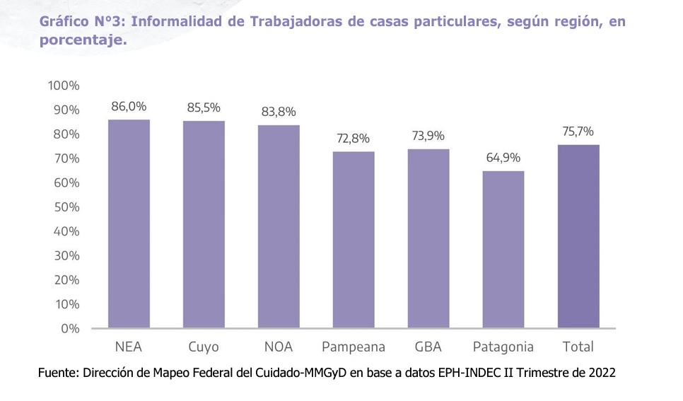 Es en este punto el INDEC también arroja datos donde son notables las diferencias regionales, ya que mientras que en el NEA 9 de cada 10 trabajadoras se encuentra en situación de informalidad, en la región Pampeana cerca de 7 de cada 10 y en la Patagonia un poco más de 6 de cada 10.