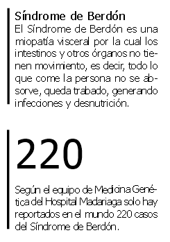 El Síndrome de Berdón es una miopatía visceral, por la cual los intestinos y otros órganos no tienen movimiento, es decir que todo lo que el paciente come queda trabado y no se absorben los nutrientes generando infecciones y desnutrición.