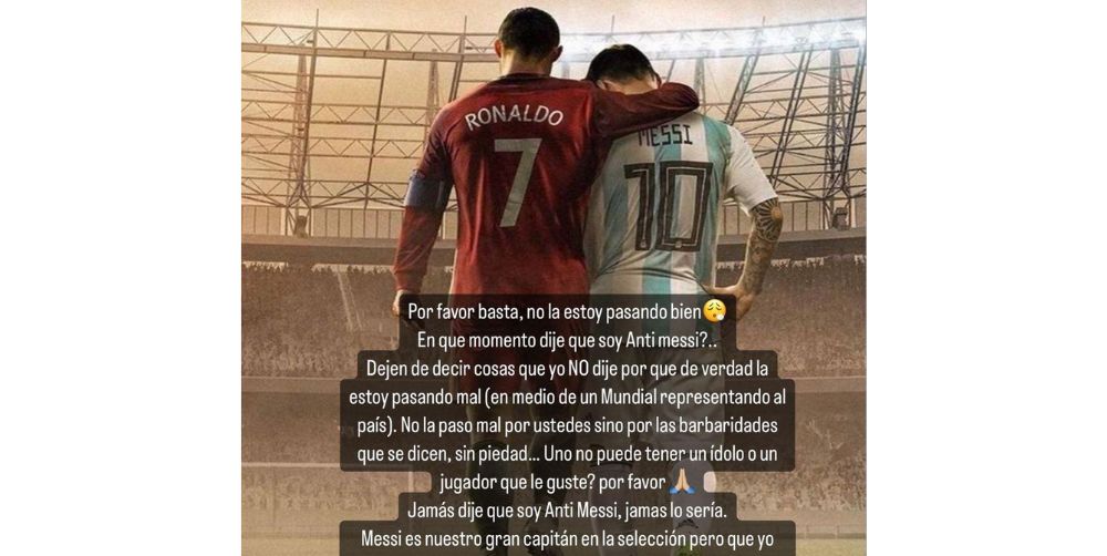 Durante las últimas horas realizó una publicación en sus redes sociales en la que aclaró que si bien su ídolo es el atacante portugués, nunca agravió al astro albiceleste y Campeón del Mundo. “Por favor entiendan que esto es fútbol y cada uno tiene sus preferencias”, indicó.