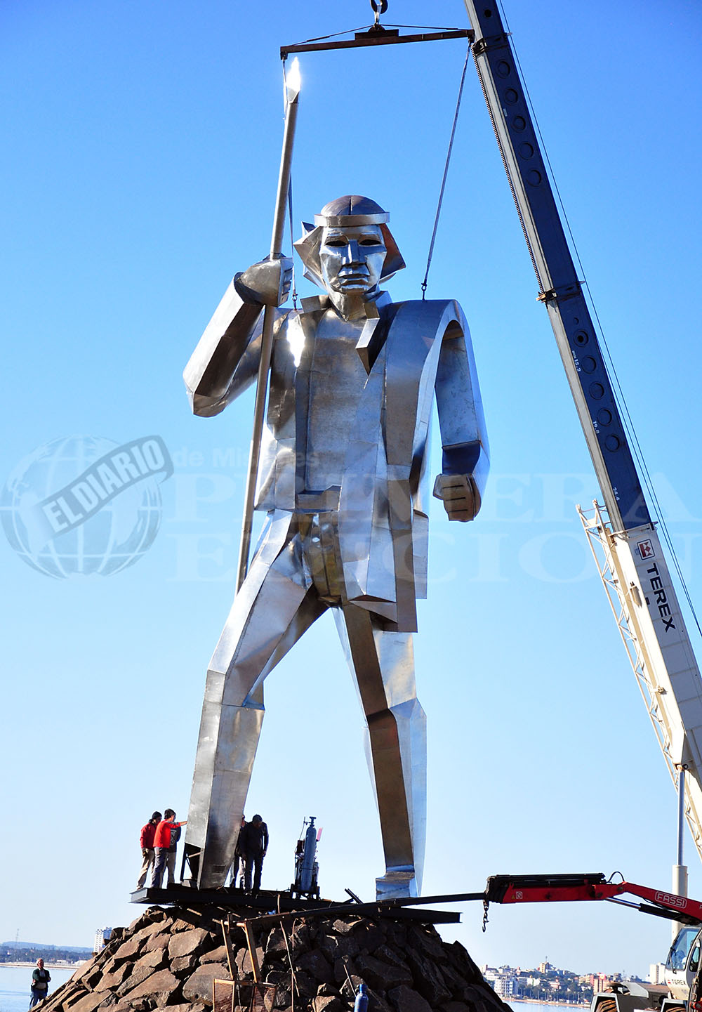 El propio Rodríguez supervisó las tareas de emplazamiento, que requirieron de un nutrido equipo de gente y una grúa especial para levantar la imagen en el islote que se preparó especialmente para ello con una base importante de hierro y hormigón armado. Sobre ella fue soldada la estructura interna de los pies, además de la lanza, que actúa como tercer soporte.