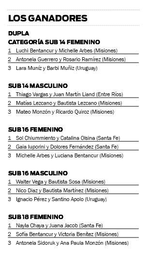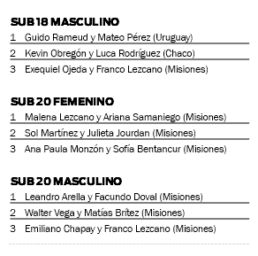 En cuanto a los resultados, Misiones festejó cuatro campeonatos. En Sub 14 Femenino, Luchi Bentancur y Michelle Arbes se consagraron; en Sub 20 Femenino lo hicieron Malena Lezcano y Ariana Samaniego y en Sub 20 Masculino festejó la dupla de Leandro Arella y Facundo Doval, todos alumnos de Costa Sur.