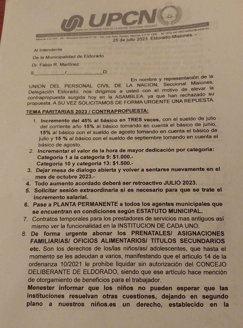 Luego de debatir en una asamblea gremial, realizada en el predio de la Secretaría de Obras y Servicios Públicos, agentes municipales de Eldorado rechazaron la contrapropuesta presentada por el Departamento Ejecutivo Municipal el pasado lunes, durante una reunión que mantuvieron representantes del gremio de UPCN con el intendente, Fabio Martínez, y parte de su equipo de trabajo.