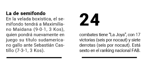 En la velada boxística, el semifondo tendrá a Maximiliano Maidana (9-0-1, 3 Kos), quien pondrá nuevamente en juego su título sudamericano gallo ante Sebastián Castillo (7-3-1, 3 Kos).