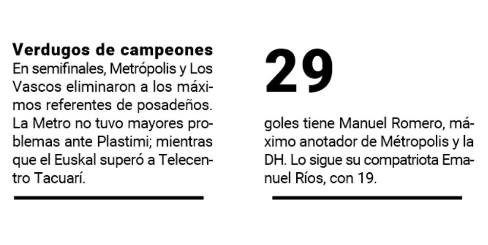 Y al nuevo monarca del salonismo capitalino se lo conocerá hoy, del encuentro que sostendrán Metrópolis y Los Vascos, dos elencos que mostraron todo su potencial en la fase de playoffs del Apertura. Se jugará a partir de las 21.30, en el Club Jorge Gibson Brown. En caso de empate, se disputará un tercer partido, el lunes 1/8, a las 21.30.