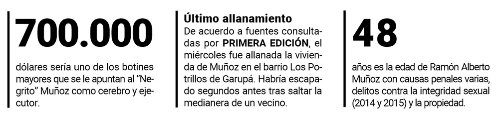 Las últimas excarcelaciones fueron rápidas por los contactos del abogado. Pero el “Negrito” Muñoz y sus hijos se mueven juntos, ellos organizan todo. Sé que tiene muchas causas penales, tampoco le pregunté cuántas. Y siempre anda con una pistola en la camioneta, siempre está armado. En Garupá también participó en el robo al hermano de un secretario de un juez (Instrucción 6). El dato para ese robo se lo dio una mujer, una comadre del “Negrito”. Cuánto dinero no recuerdo, pero él estuvo (N de la R: oficialmente se denunció 65 mil dólares y joyas).