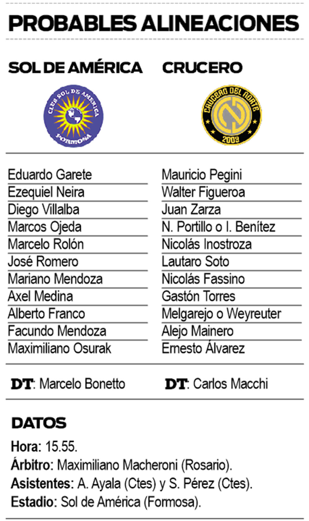 Por el lado de Sol, la única baja confirmada es la del central Julio López, que recibió una fecha de suspensión tras la expulsión que sufrió, por lo que el DT Marcelo Bonetto recurrirá a un viejo conocido en el elenco formoseño, Siego Villalba, que sería titular.