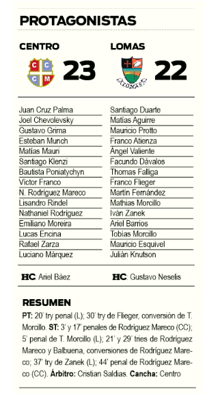 Y lo que vino al final fue cambiante y, sobre todo, muy emocionante. Porque Centro pasó arriba (20-17) con el try de “Maxi” Balbuena (convertido por Rodríguez Mareco) a los 29, pero Lomas replicó y volvió a pasar al frente (22-20) a los 37 con el try apoyado por Iván Zanek.
