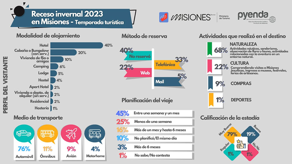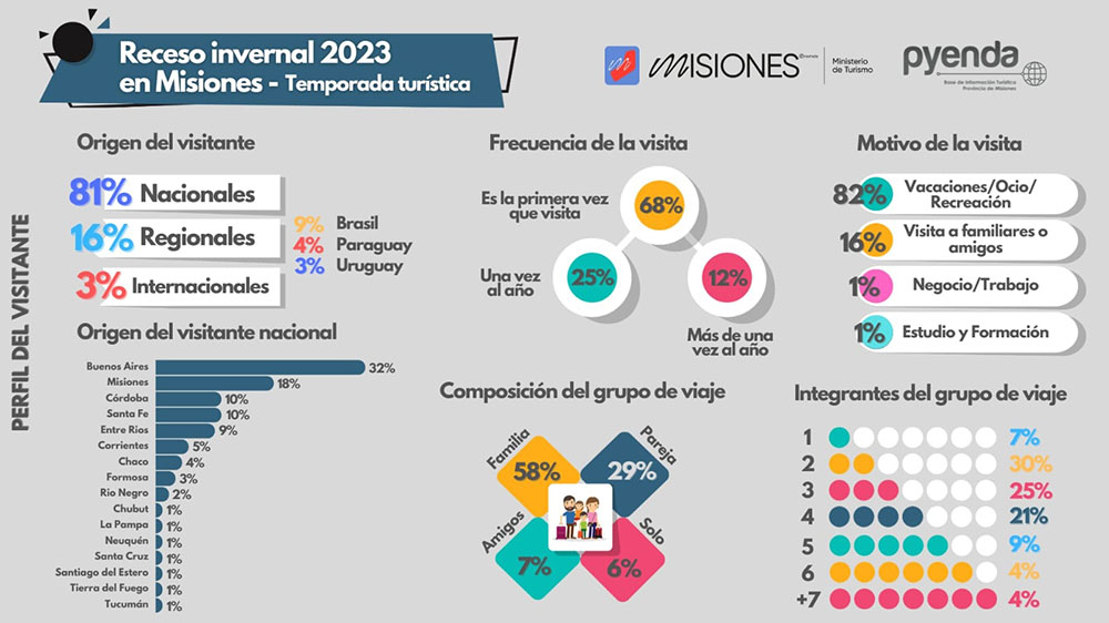 Mayormente las personas que eligen Misiones como destino para vacacionar vinieron desde otras provincias del país, alrededor de un 81%. Mientras que un 16% de los ingresos fueron de turistas regionales (oriundos de Brasil, Paraguay y también de Uruguay).