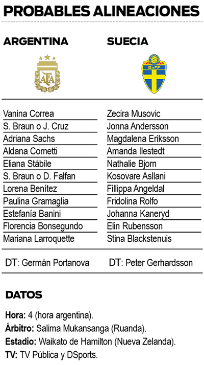El equipo dirigido por Germán Portanova tendrá un desafío muy complicado frente a Suecia, ya clasificado a octavos, en el estadio de Waikato de la ciudad neozelandesa de Hamilton, con el arbitraje de la ruandesa Salima Mukansanga. El partido, correspondiente al Grupo G, comenzará a las 4 (hora argentina) y será televisado por la TV Pública y DSports.