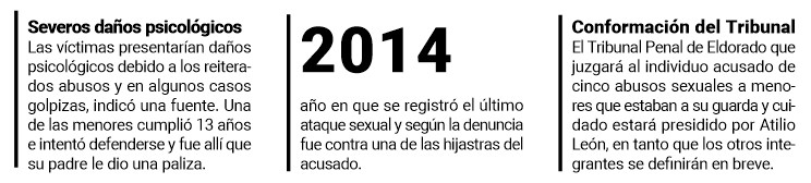Casi en forma paralela, el imputado fue denunciado por otros abusos sexuales a menores, en este caso sus dos hijastras. Estos hechos y según el Ministerio Público instructor, se registraron en una vivienda del barrio Primavera, también de Eldorado.