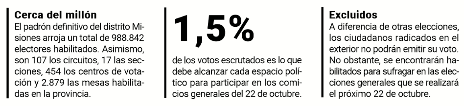 Cabe recordar que para participar en los comicios generales de octubre en cada categoría y distrito, cada espacio político deberá alcanzar un piso del 1,5% de los votos válidos emitidos, con una lista o la sumatoria de ellas.