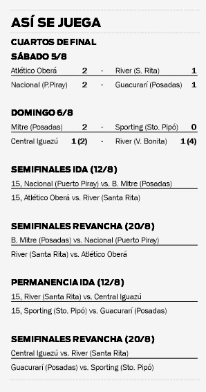 Con estos resultados, los cruces de semifinales serán entre Nacional (Puerto Piray) vs. B. Mitre (Posadas) y Atlético Oberá vs. River (Santa Rita). Por las elecciones presidenciales, ambos duelos se jugarán el sábado 12 a las 15.