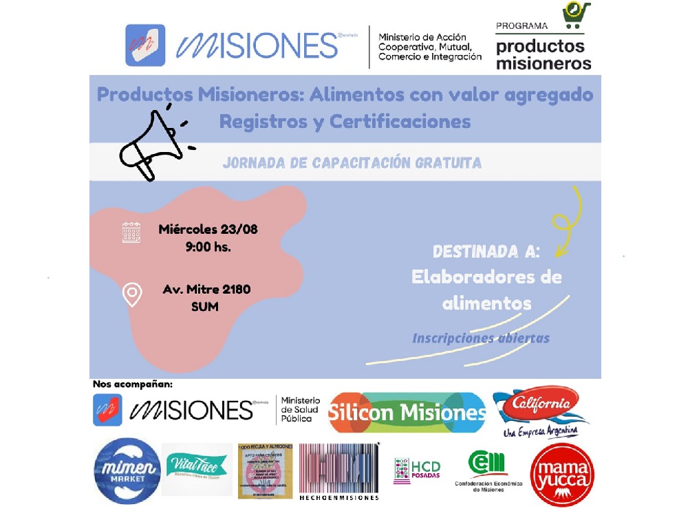 A colación de este párrafo en cuanto a la ayuda, asesoramiento y guía para integrar el Programa Productos Misioneros y así poder exhibir y vender sus productos en algún supermercado o hipermercado de la tierra colorada, “el próximo 23 de agosto, en conjunto con diferentes organismos provinciales, municipales y también empresas privadas, vamos a estar organizando una capacitación gratuita que se denomina alimentos con valor agregado, registros y certificaciones, justamente para nutrir a los elaboradores de alimento de las herramientas necesarias para que sepan cómo deben formalizar sus emprendimientos y cómo es el proceso para obtener los registros”.