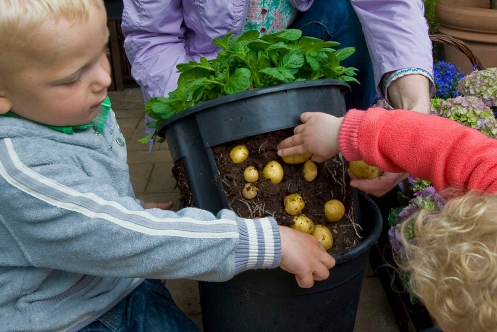 - Una maceta, un recipiente o la bolsa arpillera o de residuos en el que puedas plantar las papas, que tenga como mínimo 60 centímetros de diámetro.