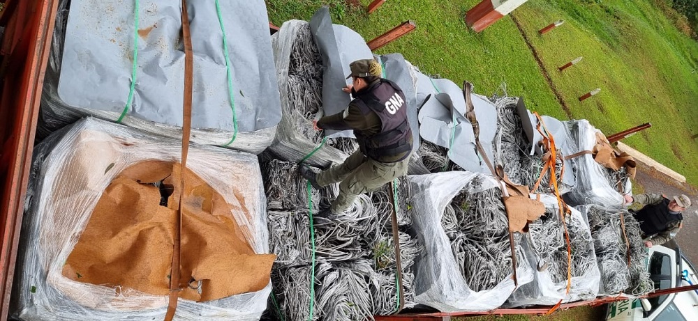 El camión, el cual ostentaba una chapa patente brasilera, transporta 10 pallets, cada uno de los cuales contenía material metálico compactado, cuyas características son similares a los cables eléctricos de alta tensión.