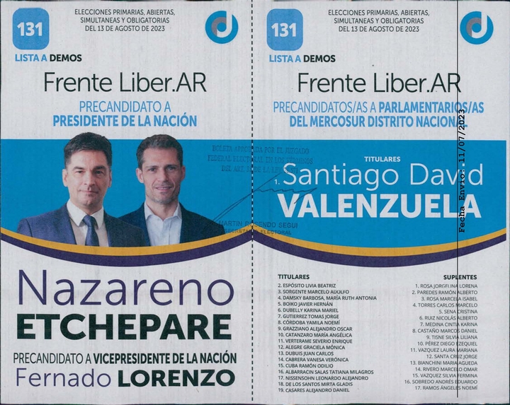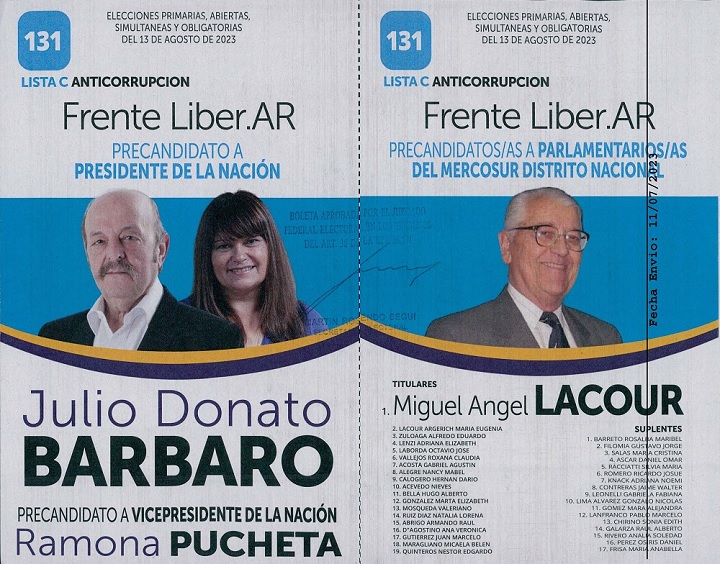 9 – Frente Liber.ar: 2 boleta a presidente, vice y parlamentarios y 1 boleta solo de presidente y vice