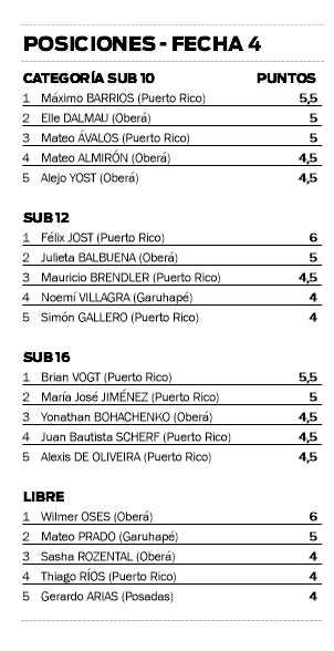 Luego de las partidas, en la categoría Sub 10, Máximo Barrios de Puerto Rico se subió a lo más alto del podio; en Sub 12, el ganador fue Félix Jost, también de Puerto Rico; en Sub 16 también hubo un puertorriqueño ganador, Brian Vogt y en la categoría Libre, el obereño Wilmer Oses se quedó con la victoria.