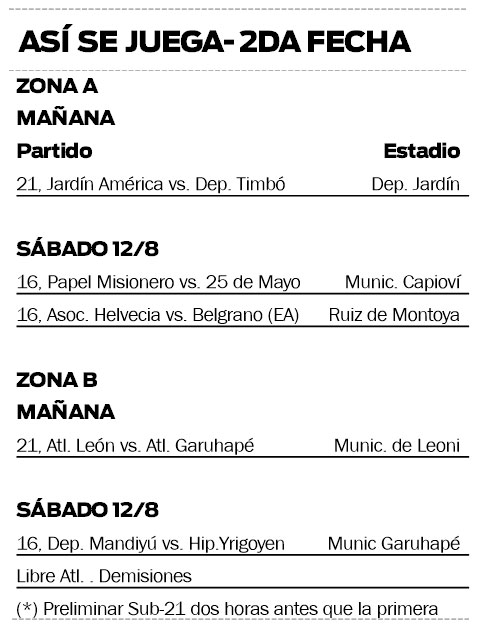 Mientras que en el estadio Municipal de Puerto Leoni, también mañana, por la zona B y desde las 21, lo hará Atlético León frente a Atlético Garuhapé. Los demás encuentros se disputarán el sábado, ya que el domingo se realizan las elecciones Paso y no habrá actividad.