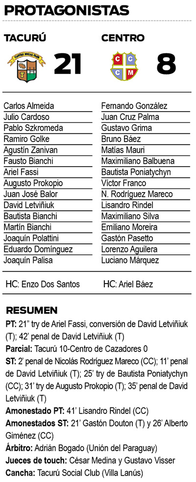 Tacurú comenzó a inclinar la balanza a su favor en el amancer del partido, porque iban apenas 21 segundos de juego cuando luego de un doble taping ante la salida de Centro, Ariel Fassi apoyó el primer try de la final, que con la posterior conversión de David Letviñuk dejó a la “Hormiga” 7-0 arriba en lo que fue un golpe duro de asimilar para el “Cazador”.