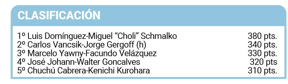 Los ganadores, Luis Domínguez y Miguel “Choli” Schmalko, lograron capturar nueve especies y completaron los cupos de dientudo, boca amarga, pirañas, bagres, bagre trompudo y cobí. En menores el ganador fue Franchesco Benítez, de seis años; mientras que el juvenil mejor clasificado fue Jorge Gergoff (h). En senior se impuso Walter Goncalves.