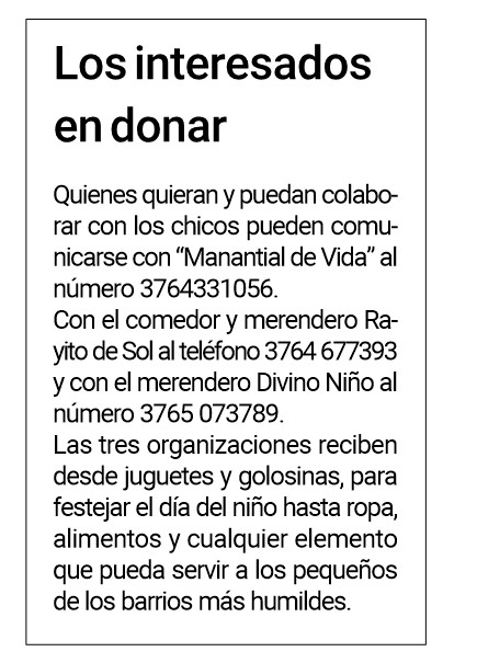 En comunicación con FM 89.3 Santa María de las Misiones, la integrante del merendero Divino Niño, Analía Ávalos, indicó que están preparando un agasajo también para el 26 de agosto: “Hace ocho años venimos preparando a pulmón la fiestita para los niños”. Está celebración se hará en el barrio Prosol I (calle 154 y 131 Casa 3, casi avenida Jauretche).