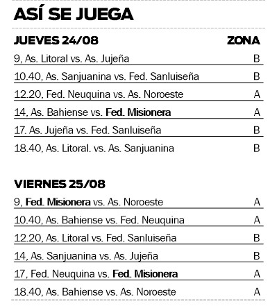 El debut de las misioneras será el jueves 24, a partir de las 14, ante la Asociación Bahiense. Luego será descanso para las misioneras que volverán a salir a la cancha el viernes, desde las 9, cuando se enfrenten a la Asociación Noroeste. Ese mismo día, pero desde las 17, cerrarán la fase de grupos ante la Federación Neuquina.
