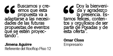 Fue diseñado para reuniones de grupos pequeños, en un ambiente familiar, confortable y distintivo. La referente del Rooftop Piso 12 “La ciudad a tus pies”, Jimena Aguirre, indicó que se trata de una propuesta “que se adapta a la vanguardia de lo que propone el mundo de eventos y convenciones y también a Posadas, ciudad que desde hace mucho tiempo se posiciona como tal”.
