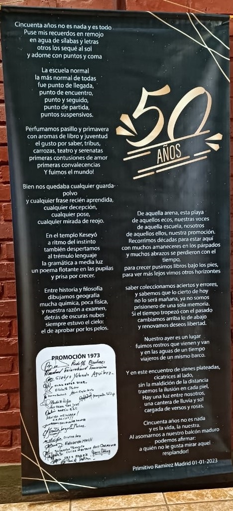 Y llegó el gran día, tan esperado. Hubo besos, eternos abrazos, y lágrimas de emoción. Bromas oportunas, risas, carcajadas. Cuando la algarabía cesó por momentos, los exalumnos se formaron, respetando el orden, pero haciendo acotaciones al compañero, como cuando estaban por pasar al aula. Después de izar la bandera nacional en el patio del colegio, de cantar el himno nacional y la canción Aurora, y del cambio de abanderados, hubo un momento para cada uno. Casi todos pasaron al frente para expresar lo que sentían estar bajo el mismo techo, compartiendo, como en aquellos tiempos.